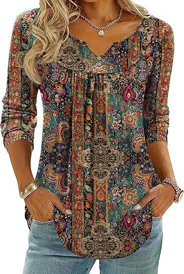 - 【UNIQUE DESIGN】: Long sleeve T-shirt, Henley V Neck Tops, Decorative Buttons Blouses, Chest Pleated Tunic, Curved Hem, Loose Fit Basic Tee